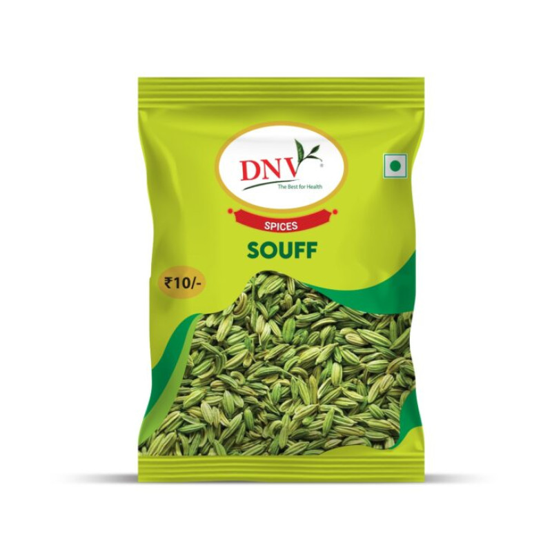 DNV Souff Seeds 11g is a pocket-sized pack of fennel seeds, also known as saunf, offered by DNV Foods. These aromatic, greenish-brown seeds are commonly used in Indian cuisine to enhance the flavor of dishes and as a natural mouth freshener. Rich in nutrients, they aid digestion and are often consumed after meals to promote better digestion and fresh breath. This 11g pack is ideal for occasional use or to try out the product before purchasing larger quantities. DNV Foods ensures the seeds are doubly cleaned—both machine and manually—to maintain purity and quality. The product is FSSAI certified, ensuring it meets food safety standards.