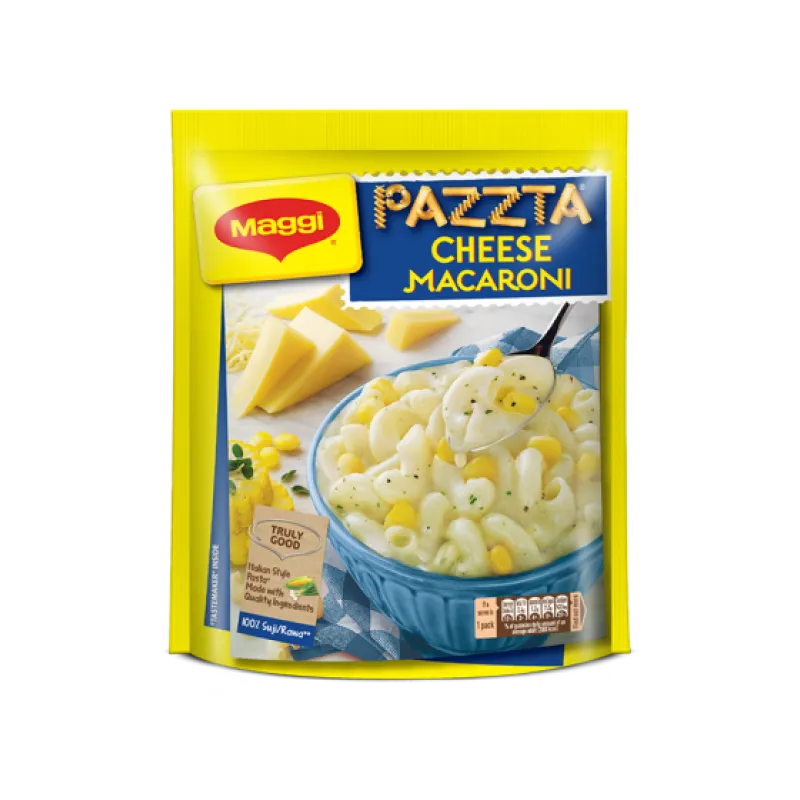 Maggi Pazzta Cheese Macaroni (75g) is a quick and delicious snack made from 100% suji (semolina). This vegetarian pasta is ready in just 5 minutes, making it ideal for busy days. It features a creamy cheese flavor with hints of sweet corn, black pepper, and oregano. Each serving provides approximately 321 kcal, 9.9g protein, and 63.7g carbohydrates . The product contains wheat and milk and may have traces of mustard and soy.